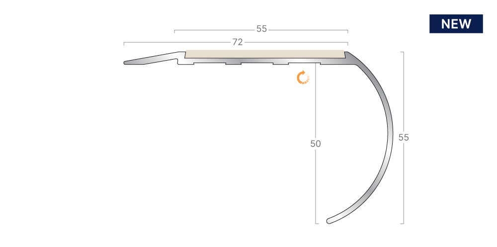 This bullnose, single channel, ramp back profile features a 70mm tread and 55mm riser to meet the guidance in Approved Document M and BS 8300-2:2018. It is ideal for use where there are no surface floorcoverings or with resilient flooring. When used with resilient flooring ADM9 should be installed on top of the floorcovering.