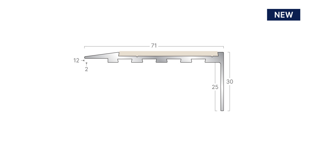 ASV1R is a square, single channel profile with a 71mm tread and 30mm riser. It incorporates a notched ramp back that has been designed to overlay 2mm vinyl floorcovering. This provides a neat finish, protects the edge of the vinyl from lifting and ensures a safe transition.