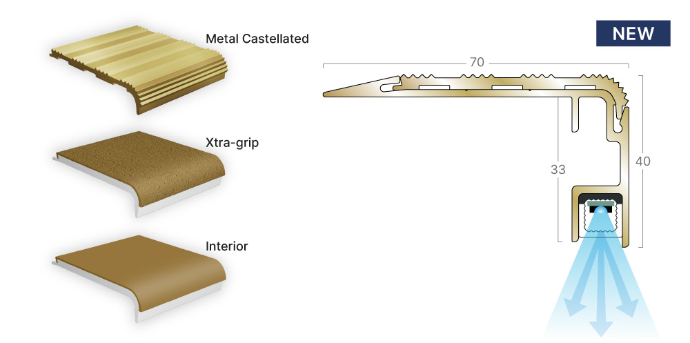 BLXT20R Bronze LED Step Lighting Profile comprises a bronze channel with a choice of insert material that extends around the leading edge of the profile to ensure that foot contact is always made with the slip-resistant element of the stair edging.