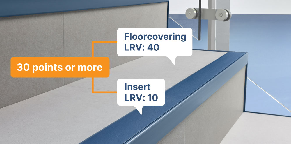 Example: If the flooring has an LRV of 50, the stair edging should have an LRV between 0–20 or 80–100 to achieve the required contrast.