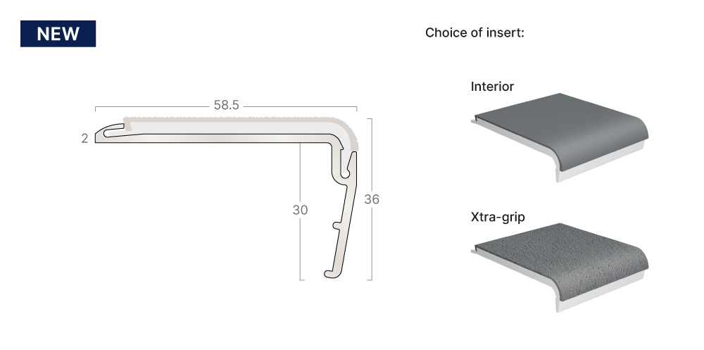 RXT251 stair edging (nosing) combines a coloured PVC-u channel with slip-resistant inserts that extend around the leading edge of the profile to ensure that foot contact is always made with the slip-resistant element of the stair edging.